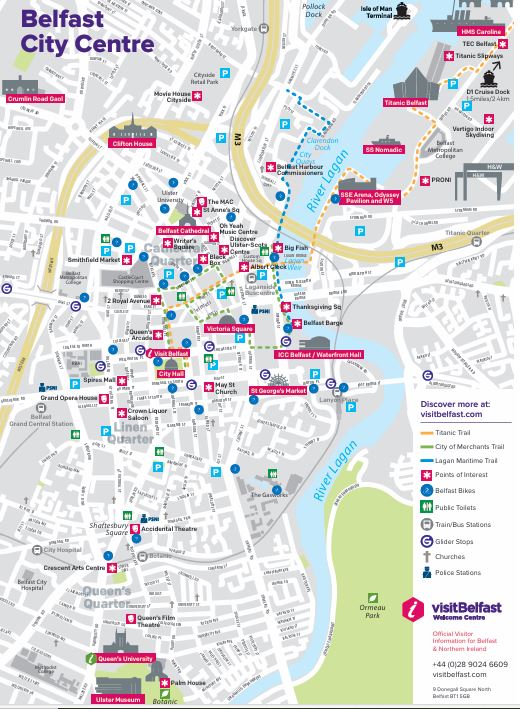 Mit dem Nachtbus N8 um 4:29 zum Handelskai, um 4:39 mit der Schnellbahn S7 zum Vienna International Airport, mit BA 707 um 7:45 nach London-Heathrow (VEREINIGTES KÖNIGREICH GROßBRITANNIEN; planmäßige Landung 9:15, -1). Regen. Nach Terminalwechsel von 11:40 bis 13:05 Inlandsflug mit BA 1412 mit Blick auf das hinter den Kränen David und Goliath liegende Titanic Museum zum George Best City Airport nach Belfast (in Nordirland / Ulster), die Stadt, die im 19. Jhdt. ihren Aufstieg der Leinenweberei, der Druckerei, der Seilerei und dem Schiffsbau verdankte. Wetter trocken, wechselhaft, 13° bis 15°. Beide Flüge leicht verspätet. Von 14:00 bis 14:30 problemlos mit dem Translink Airport Express 600 über die Queens Bridge in das Stadtzentrum zur Grand Central Bus- und Bahnstation und zu Fuß mit leichten Umwegen über das Grand Opera House (das größte Belfaster Theater) und drei Pubs, darunter der berühmte The Crown Liquor Saloon, zum Leonardo Hotel gegenüber der dominanten Presbyterian Historical Society (Assembly Buildings). Einchecken um 15:15. Großes Zimmer mit Blick auf das mächtige John Bell House (das als Hotel und für Studentenwohnungen genutzt wird). Inzwischen Regen. 16:20 weiter zu Fuß zum Hauptplatz Donegal Square (imposantes Rathaus Belfast City Hall, Cenotaph, Queen Victoria-Denkmal und andere Monumente etc.) Ins Belfast Visitor's Centre an der Nordseite des Platzes wg. Informationen über die Anfahrt zu den beiden UNESCO-Weltkulturerbestätten Nordirlands und Kauf einer in ganz Nordirland geltenden und an einem beliebigen Datum einlösbaren 24h-Karte für den ÖPNV. Weiter nach Norden zur St. Anne's Cathedral (geschlossen) und kurz in das eben schließende Northern Ireland War Memorial (Schwerpunkt WW II), dann nach Südosten vorbei an der Albert Memorial Clock (dem „Schiefen Turm von Belfast“; inzwischen stabilisiert) zum Abendessen ins ausgezeichnete Pub McHugh’s , „by far the oldest building in Belfast“ (Fish'n Chips + Kilkenny). Danach zur Skulptur Big Fish an den River Lagan und zurück zum Hotel (Ankunft 18:30). |
