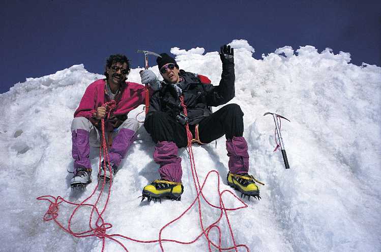 Geschafft! Geri Winkler (links) und Thomas Knob (rechts) am 19.7.1998, ca. 12 h, auf dem 6088 m hohen Huayna Potosi - Photo: Nicolas Waelchli