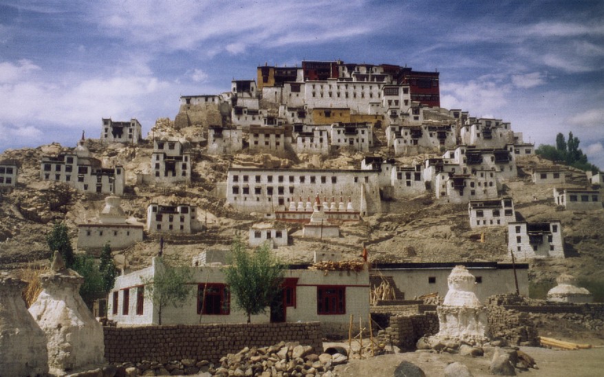 | Di, 11.7.: | Vo Jeepfahrt zum Kloster Hemis (ca. 3700 m, die letzten 150 Höhenmeter zu Fuß) und Besuch des jährlichen Hemis-Festes - Mi Essen an einem Indus-Kanal - Na Besichtigung des Klosters Thikse (s. Photo) - Rückfahrt durch Wasser verspritzende Kinder (Hemistag) erschwert - In Leh Stadtspaziergang - Internet |