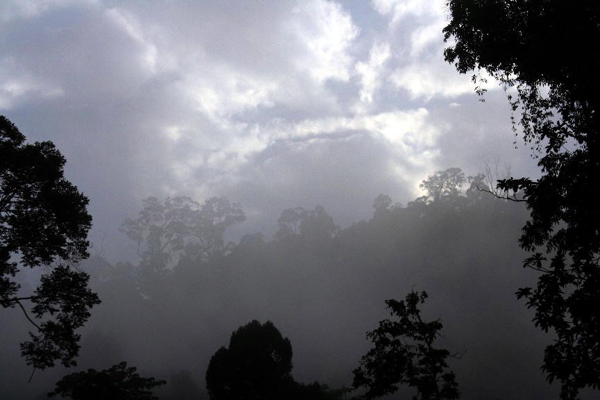 | So, 17.8.: | Himmel blau, heiß. 730 Frühstück, ab 820 in mehr als zwei Stunden Urwaldtrekking zum Hornbill-Wasserfall (benannt nach den in Borneo weit verbreiteten "Nashornvögeln"). Schwimmpause im natürlichen Pool unterhalb des Falls. Nach der Rückkehr und der Blutegelentsorgung (Überprüfung der gesamten Kleidung) gegen 1400 Mittagessen und Pause (Duschen, Lesen) bis zum Abendessen um 1900. Danach starker Regen. |