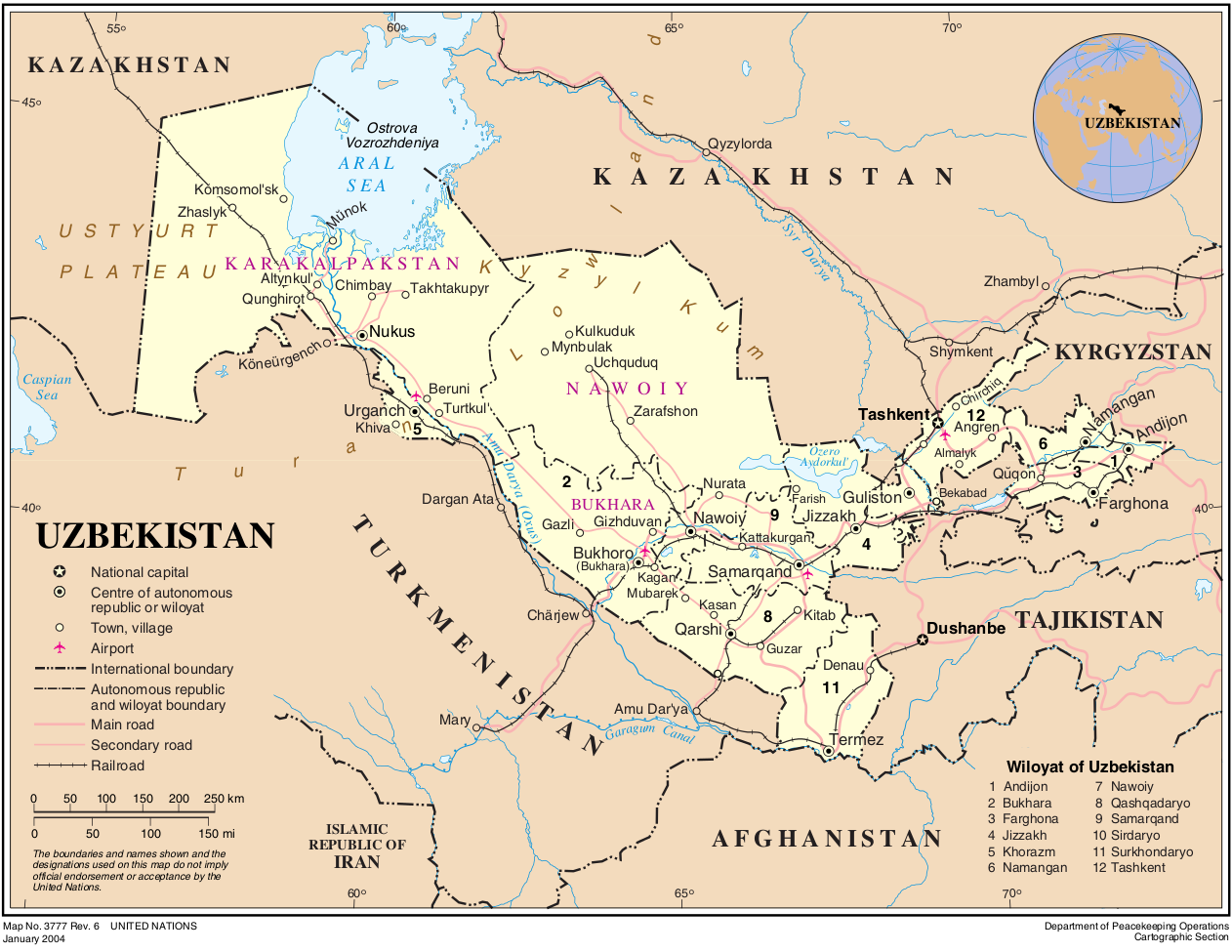 Karte von Usbekistan (Public Domain-Datei: http://www.weltkarte.com/asien/usbekistan/politische-karte-uzbekistan.htm)