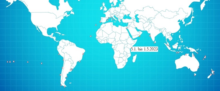 Erdkarte (rote Dreiecke = planmäßig anzulaufende Häfen):