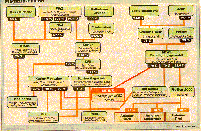 Abweichend von der Graphik ist der Anteil der Bertelsmann-Tochter Gruner + Jahr an der News-Gruppe nunmehr von 75 % auf 52,5%, der der Fellner-Stiftung von 25% auf 17,5% reduziert worden. Die ZVB hält jetzt die restlichen 30%.