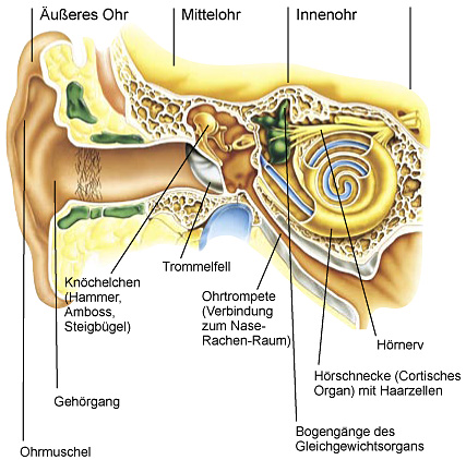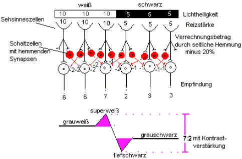 Allgemeine Begriffe ⇘ (Reizschwellen - Adaptionsniveau - Empfindung - Wahrnehmung) - Reizleitung ⇘ (Erregungsbahn - Sinnes- und Nervenzellen - Ionentheorie der Erregung) - Das Gehirn ⇘ (Allgemeines - Funktionen und Aufbau - Forschungsmethoden - Daten - Hirnhälftentheorien - Aktivierungsniveau - Der Schlaf - Neuere Ergebnisse der Hirnforschung) - Optische Wahrnehmung - Das Auge ⇘ (Sinneszellen - Funktionsweise - Sehstörungen - Farbsehen - Kontrast- und Konstanzphänomene - Optische Täuschung - Tiefensehen - Bewegungssehen) - Akustische Wahrnehmung, Raumlagesinn - Das Ohr ⇘ (Aufbau und Funktion der Ohren - Daten - Hörstörungen - Tonmischung - Hydrodynamische Hörtheorie - Das Ohr als Gleichgewichtsorgan / Vestibularapparat) - Olfaktorische Wahrnehmung - Die Nase ⇘ (Allgemeines - Geruchstheorien - Einzelne Gerüche) - Geschmackswahrnehmung - Die Zunge ⇘ (Funktionsweise und Biologie - Geschmacksrichtungen) - Haptische Wahrnehmung - Die Hautsinne ⇘ (Allgemeines - Rezeptoren) - Die Zeitwahrnehmung ⇘ (Allgemeines - Steuerung - Psychische Präsenzzeit - Circadianer Rhythmus - Moment - Beeinflussung der Zeitwahrnehmung) - Die Gestaltwahrnehmung ⇘ (Gestaltbegriff - Kohärenzfaktoren - Intuition) - Wovon hängt ab, was und wie wir wahrnehmen? ⇘ (Angeborene und erworbene Voraussetzungen - Einstellung und Aufmerksamkeit - Bezugsrahmen - Ausdruck und Eindruck) [Dieses Kapitel ⇘]