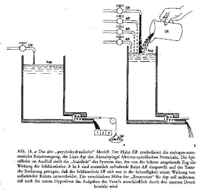 Nach dem Homöostatischen Prinzip (Tendenz zur Herstellung eines inneren Gleichgewichts; s. a. o.) läuft die Instinkthandlung entweder von alleine ab (s. u.), wenn der Druck zu groß wird (der Korken wird durch die Wassersäule herausgedrückt, wenn eine gewisse Zeit vergangen ist), oder sie wird durch einen Schlüsselreiz (s. u.) ausgelöst (der in der neueren Variante des Modells durch eine rasch eingeschüttete Kanne Wasser symbolisiert wird). Beides führt zu einer Spannungsreduktion. (Zu Jungs Sichtweise auf Instinkt und Bewusstsein s. o.; im Gegensatz zu Lorenz leugnete - s. hier - der chinesische Experimentalpsychologe Zing-Yang Kuo / 郭任遠, 1898-1970, als radikalster Vertreter der damaligen behaviouristischen Anti-Instinkt-Strömung in der Psychologie jedes angeborene bzw. ererbte Verhalten.)