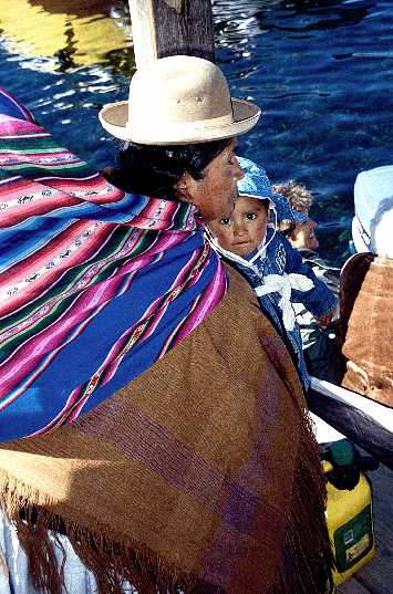 Die Prä-Inka-Kultur von Tihuanaco Bolivianerin mit Kind am Titicacasee