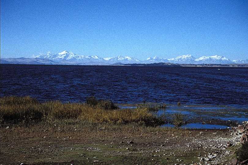 Der Titicacasee mit der Cordillera Real von der Grenze Peru - Bolivien
